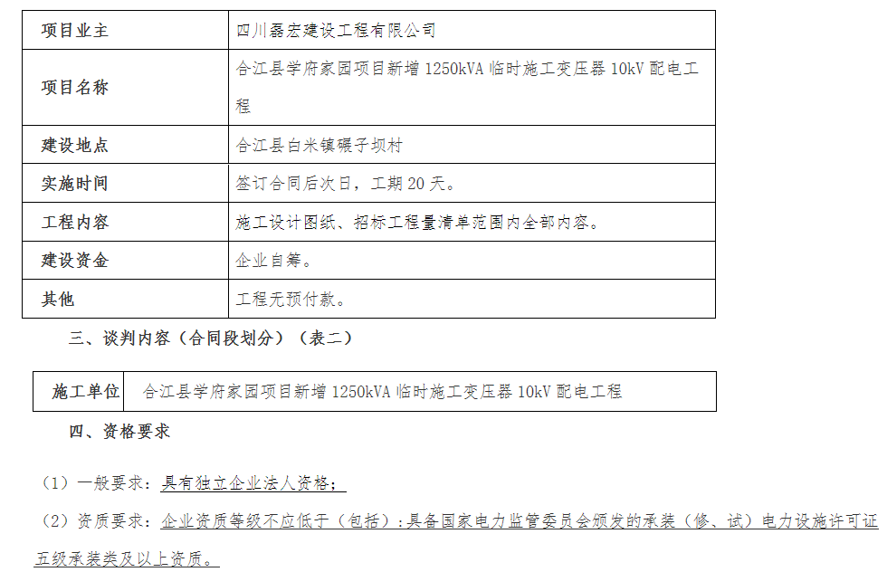 一 、 本 次 談 判 項 目 合 江 縣 學 府 家 園 項 目 新 增 1250kVA 臨 時 施 工 變 壓 器 10kV 配 電 工 程 施 工 單 位 , 現(xiàn) 通 過 競 爭 性 談 判方式選擇和確定承包人,誠邀符合資格條件的潛在申請人參與本項目的競爭性談判。