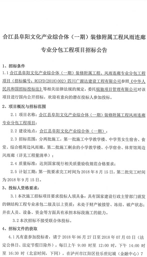 合江縣阜陽文化產(chǎn)業(yè)綜合體(一期)裝修附屬工程風(fēng)雨連廊專業(yè)分包工程項目招標(biāo)公告.doc