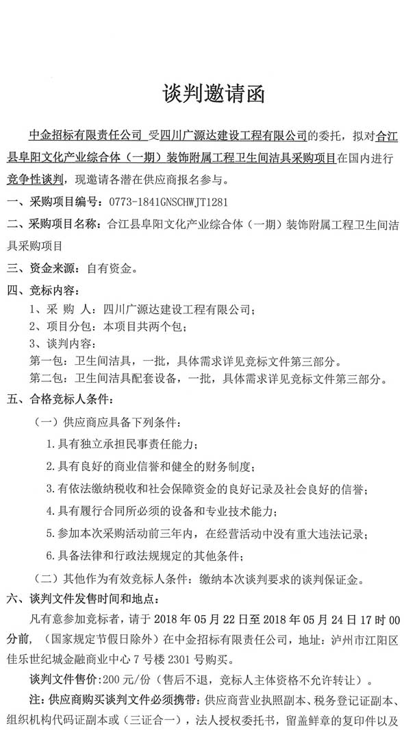 談判邀請(qǐng)函(合江縣阜陽(yáng)文化產(chǎn)業(yè)綜合體(一期)裝飾附屬工程衛(wèi)生間潔具采購(gòu)項(xiàng)目).doc