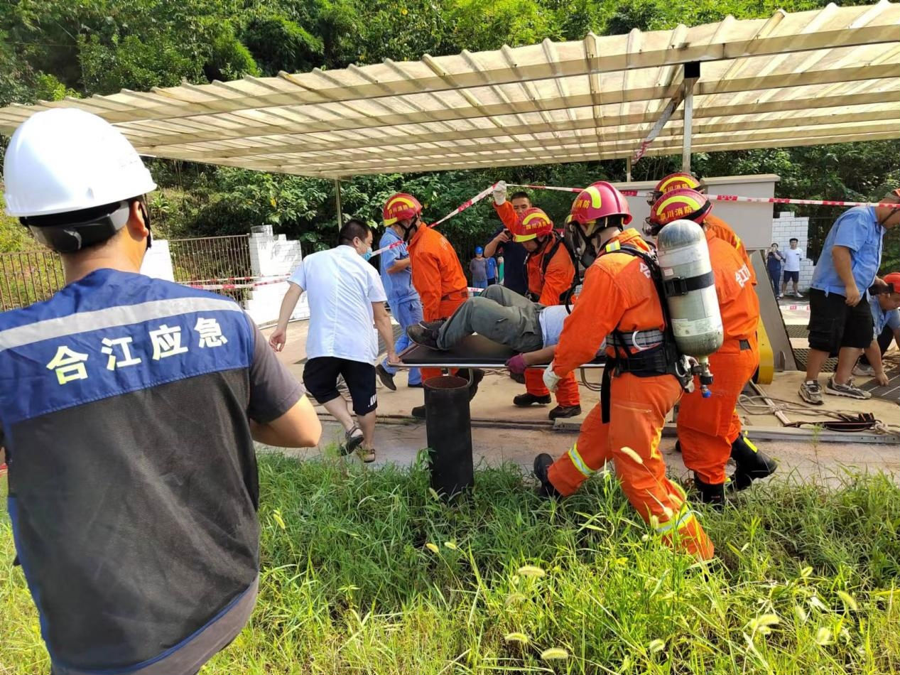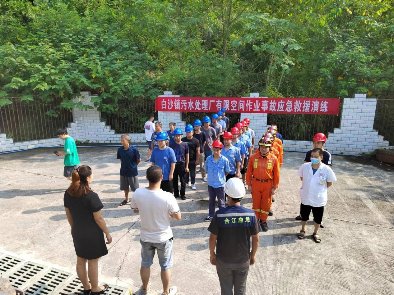 2022 年 8 月 5 日, 白沙鎮(zhèn)人民政府、 江北消防中隊(duì)、 白沙衛(wèi)生院和瀘州匯鑫環(huán)??萍加邢薰韭?lián)合在白沙鎮(zhèn)城市生活污水處理廠開展有限空間作業(yè)應(yīng)急演練, 白沙鎮(zhèn)副鎮(zhèn)長周雪蓮、 安辦主任牟葉奎、 江北消防中隊(duì)指導(dǎo)員王小峰、 匯 鑫公司副經(jīng)理劉可參加了本次演練。