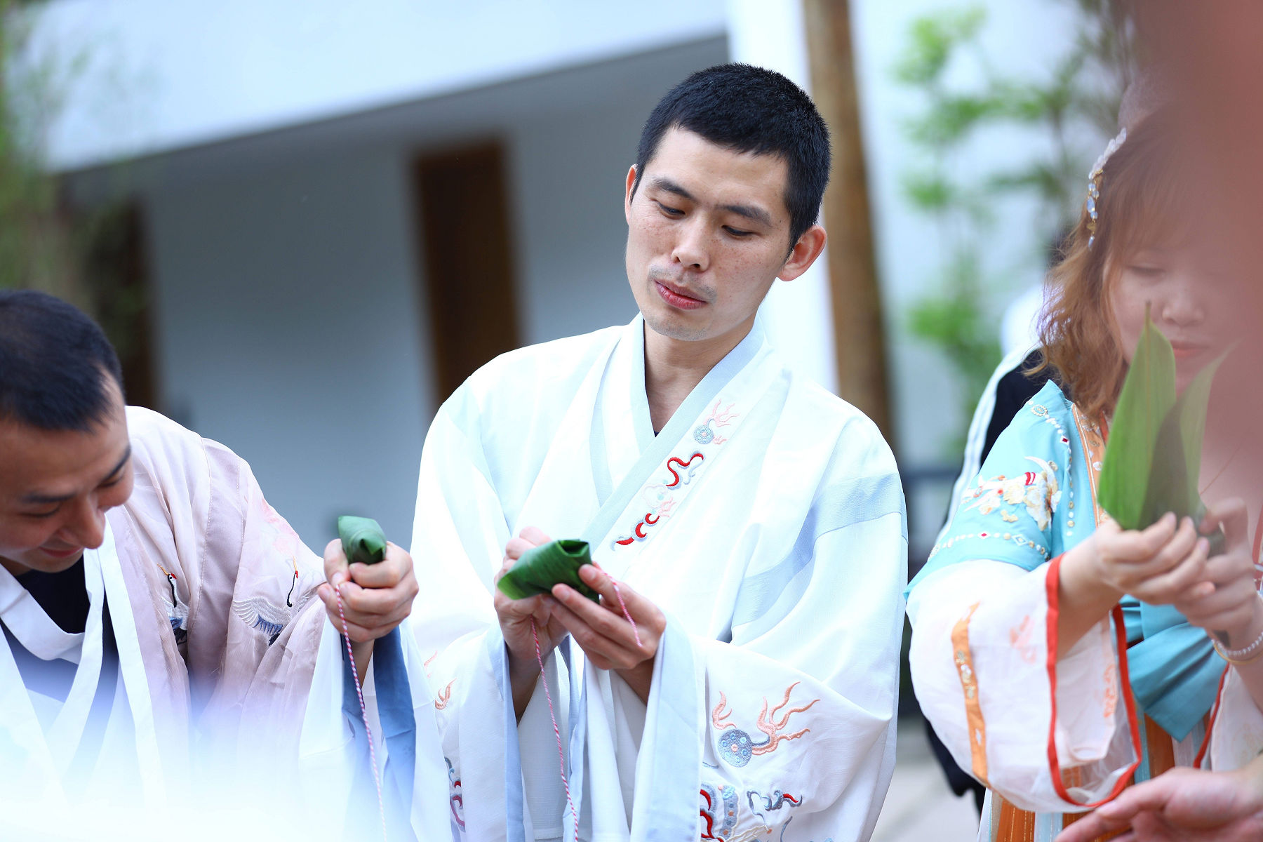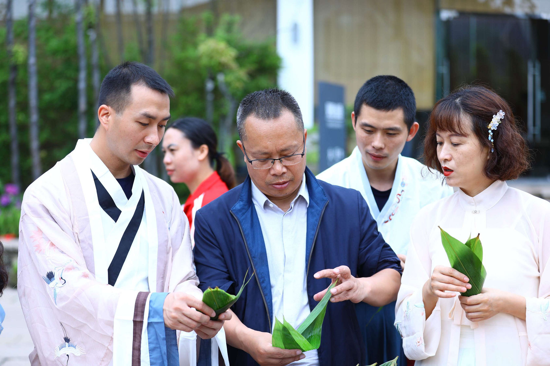 龍掛山景區(qū)是阜陽集團下屬符陽文旅公司打造的的文 化休閑度假旅游目的地, 景區(qū)云霧如海, 美景如畫, 建筑獨 具傳統(tǒng)川南民宿特色。 活動中, 阜陽集團員工身著漢服, 人 與自然情景交融、交相輝映,仿若穿越到了“狗吠深巷中、 雞鳴桑樹顛”的古代美好田園生活。在見禧 . 山語的院子里, 大家圍成一圈, 開展包粽子比賽。 員工們踴躍參加、 興致高 漲, 集團總經理任東財和員工們一起動手, 互相學習、 邊學 邊包、 比拼手藝, 包出了三角形、 長方形、 圓錐形等形態(tài)各 異的粽子,現(xiàn)場洋溢著歡樂的節(jié)日氣氛。